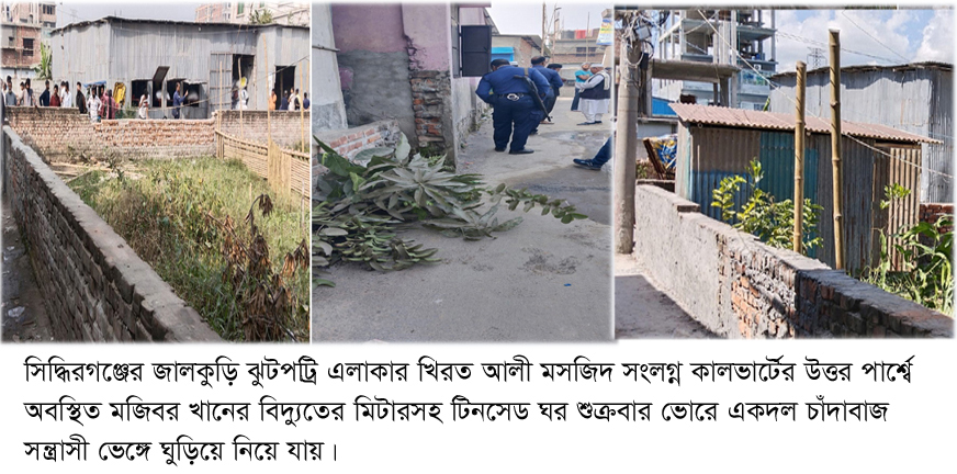 জানা গেছে, সিদ্ধিরগঞ্জ থানাধীন জালকুড়ি মৌজার ৮৯৫ নং দাগে ৪.৩৭ শতাংশ সম্পত্তি বিগত ১৪ আগষ্ট একটি অপ্রত্যাহার যোগ্য পাওয়ার অব এটর্নী দলিল (নং-৬৯৩১) মূলে মালিক হন মজিবর খান। জমির মূল মালিকগন উক্ত জমি মজিবর খানের বরাবর দখল বুঝিয়ে দেয়ার পর সেখানে টিনের ঘর নির্মান করে এবং বিদ্যুতের সংযোগ দিয়ে ভোগ দখলে রয়েছেন। শুক্রবার ভোরে কেউ কিছু বুঝে উঠতে না উঠতেই চাঁদাবাজ ভ’মিদস্যু সন্ত্রাসী সোয়েল,জয়নাল,কামরুল,শফিকুল,হাসান ও সোহেল জোর পূর্বক দখল করার হীন উদ্দেশ্যে মজিবর খানের টিনসেড ঘর ভেঙ্গে এবং বিদ্যুতের মিটারসহ নিয়ে যায়।