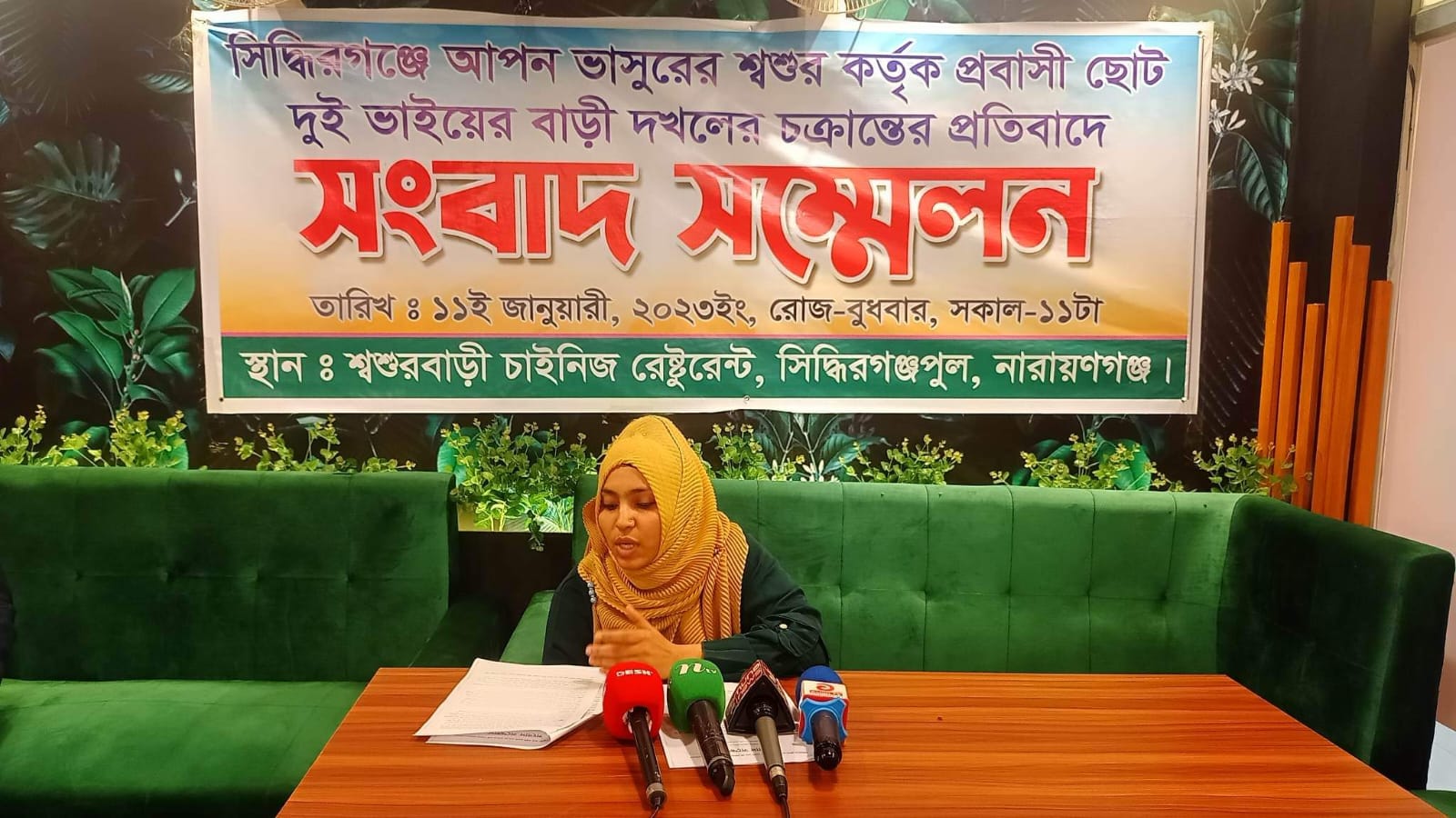 সংবাদ সম্মেলনে আয়েশা আক্তার বলেন, তার প্রবাসী স্বামী নূর নবী এবং তার স্বামীর মেঝো ভাই আলমের সম্পদ দখল করে রেখেছে তার বড় ভাসুর নূরুল ইসলামের শশুর মাহবুব এনামুল হক।