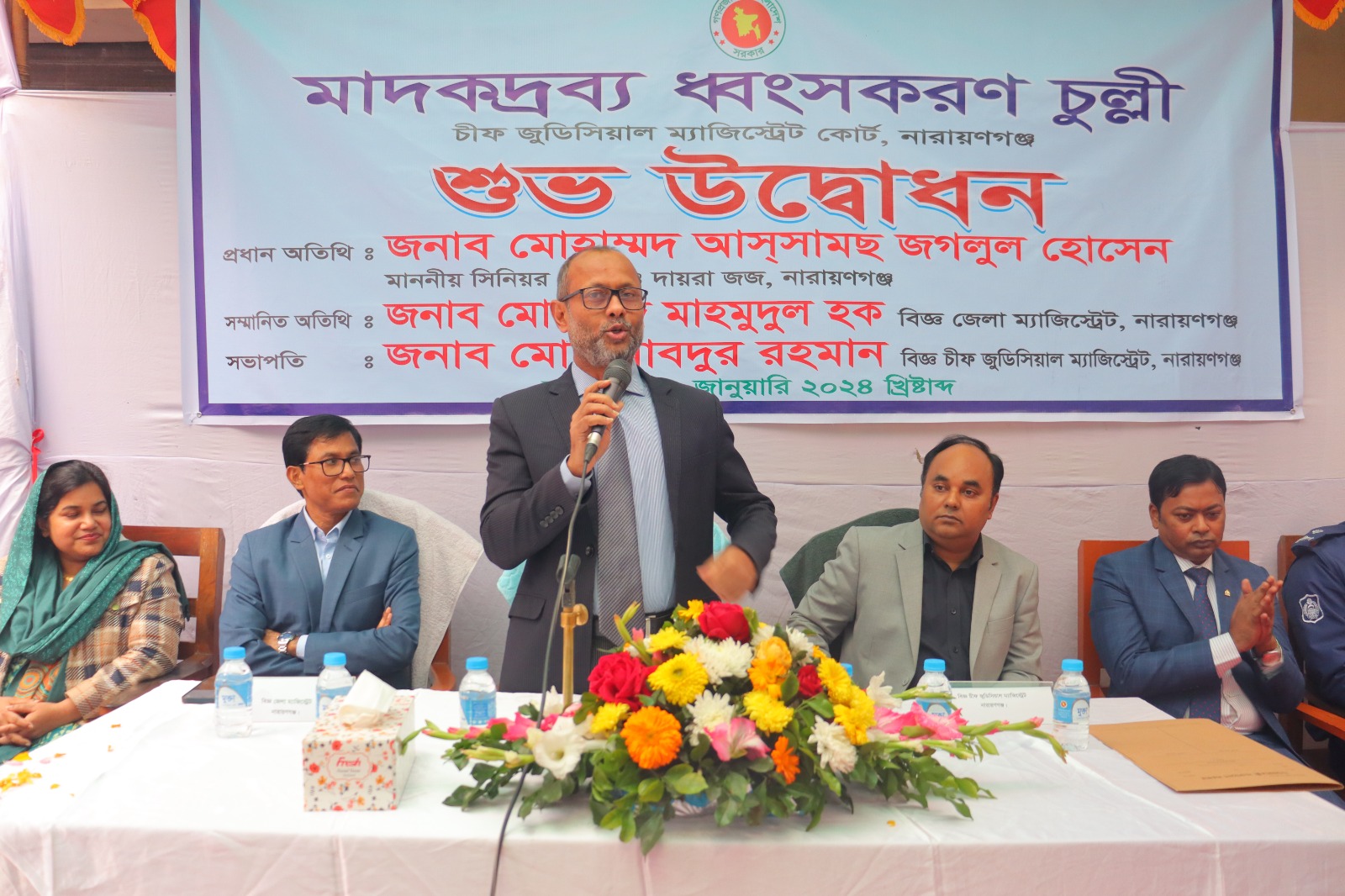 বুধবার (১৭ জানুয়ারি ) বিকেলে নারায়ণগঞ্জ জেলা জজ আদালত প্রাঙ্গণে মাদক মামলার বিভিন্ন আলামত ধ্বংসের জন্য মাদকদ্রব্য ধ্বংসকরণ চুল্লির শুভ উদ্বোধন করেন প্রধান অতিথি নারায়ণগঞ্জের সিনিয়র জেলা ও দায়রা জজ মোহাম্মদ আসসামছ জগলুল হোসেন। অনুষ্ঠানে সম্মানিত অতিথি হিসেবে উপস্থিত ছিলেন, নারায়ণগঞ্জের বিজ্ঞ জেলা ম্যাজিস্ট্রেট মোহাম্মদ মাহমুদুল হক। অনুষ্ঠানে সভাপতিত্ব করেন, বিজ্ঞ চীফ জুডিসিয়াল ম্যাজিস্ট্রেট মোঃ আবদুর রহমান। এ সময় আরও উপস্থিত ছিলেন, নারায়ণগঞ্জ অতিরিক্ত চীফ জুডিসিয়াল ম্যাজিস্ট্রেট মোহাম্মদ বদিউজ্জামান, অতিরিক্ত জেলা ম্যাজিস্ট্রেট মৌসুমি বাইন হিরা, মাদকদ্রব্য নিয়ন্ত্রণ অধিদপ্তরের উপ-পরিচালক মো: মামুন, এডিশনাল এসপি (প্রসিকিউশন) আব্দুল্লাহ আল মাসুদ,সিনিয়র জুডিসিয়াল ম্যাজিস্ট্রেট সানজিদা সরওয়ার,শামসাদ বেগম,মো: কাউছার আলম,মো: ইমরান মোল্লা,কাজী মোহাম্মদ মোহসেন,নুসরাত সাহারা বিথী, মোহাম্মদ সামছুর রহমান,মো: নূর মহসিন,শাফিয়া শারমিন।