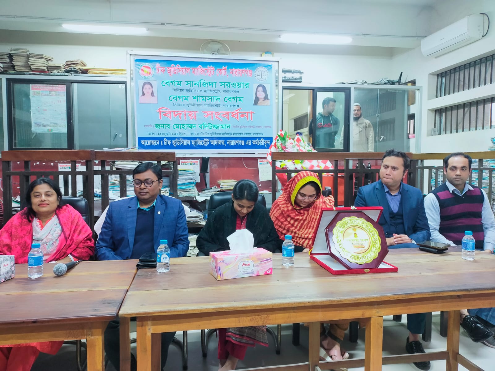 মঙ্গলবার বিকালে নারায়ণগঞ্জ চীফ জুডিশিয়াল ম্যাজিষ্ট্রেট আদালত কার্যালয়ে আয়োজিত বিদায় অনুষ্ঠানে সভাপতিত্ব করেন, বিজ্ঞ চীফ জুডিসিয়াল ম্যাজিস্ট্রেট (ভারপ্রাপ্ত) মোহাম্মদ বদিউজ্জামান। উক্ত অনুষ্ঠানে অন্যান্যদের মধ্যে বিজ্ঞ সিনিয়র জুডিসিয়াল ম্যাজিস্ট্রেট কাজী মোহাম্মদ মোহসেন, মোঃ কাউছার আলম, নুসরাত সাহারা বীথি, মোহাম্মদ শামছুর রহমান উপস্থিত ছিলেন।